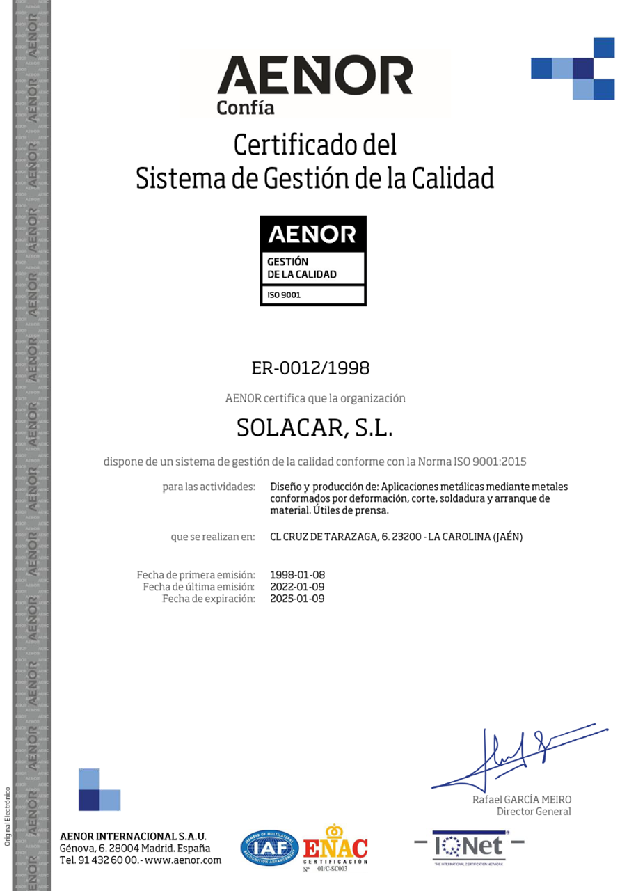 Solacar incorpora la gestión de la calidad como parte esencial de su estrategia y de su desarrollo. Así desde el año 1999 se dispone del certificado ISO 9001, actualmente disponemos del certificado ISO 9001:2015.